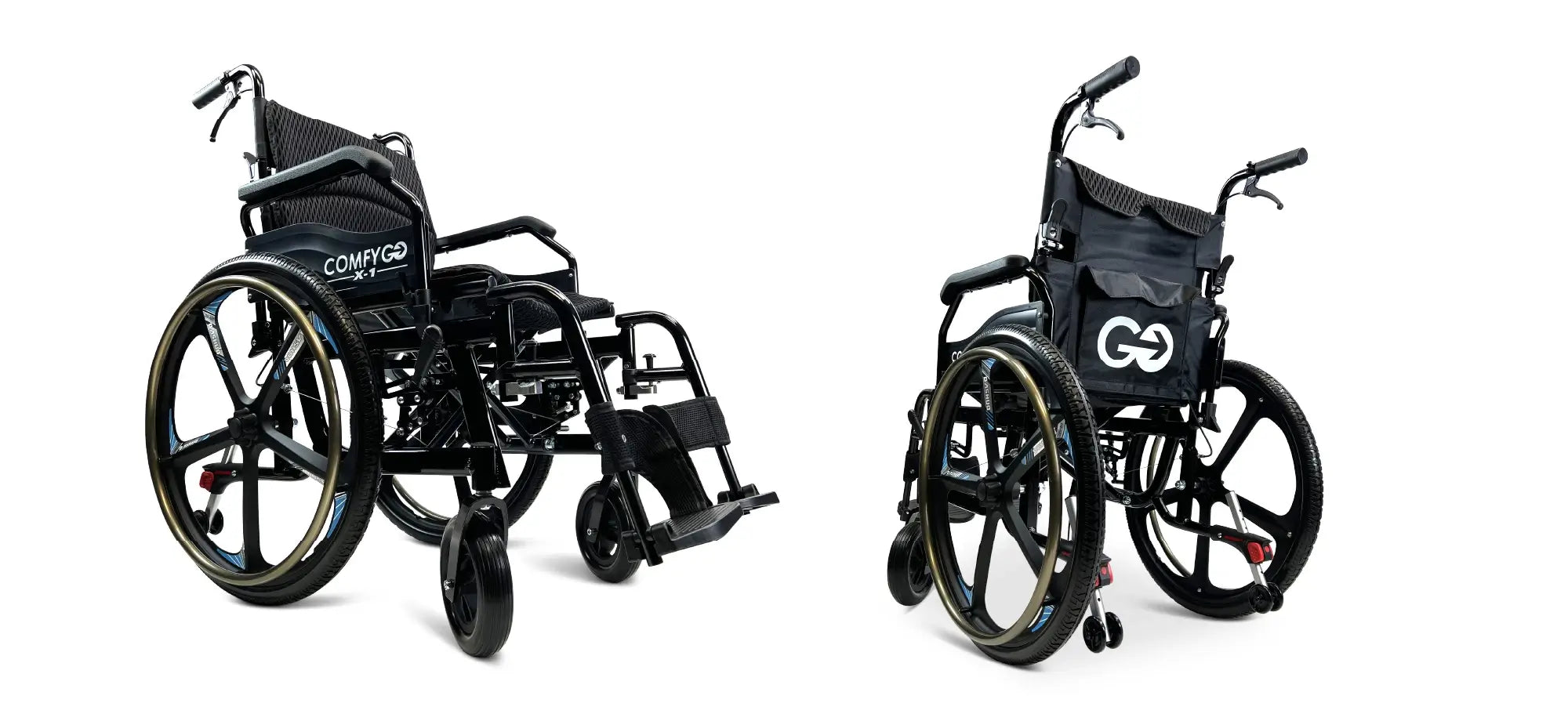 We have an X-1 manual wheelchair and it has become our travel chair due to the ease of use and the way it folds to save space. My wife weighs about 220lbs and this chair handles her with ease. We have had some trouble with the caregiver brake handles due to broken springs, however Comfy Go has replaced these under warranty for just the cost of shipping. I don’t feel the springs are the Comfy Go fault rather I think they have received faulty springs from their vender and hopefully this issue will be resolved. With this exception of broken springs I would recommend this chair highly.